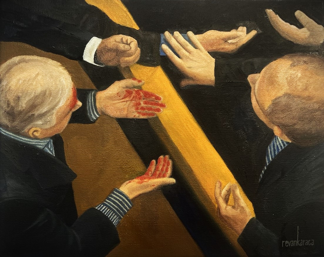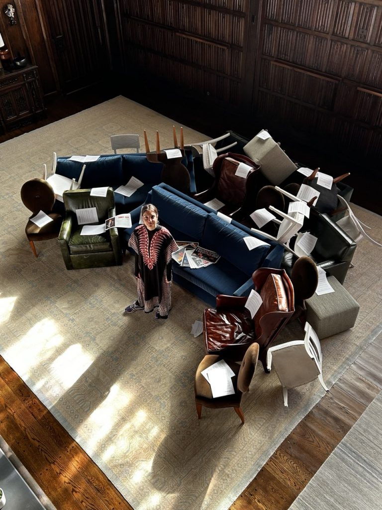 During the art residency program at Foundation House in Greenwich, Connecticut in November 2024, Revan Karaca created an immersive art installation that delved into themes of legislative violence and political conflict. The installation featured two new paintings from her series POLITICS, displayed within a spacious room decorated with design furniture that evoked the atmosphere of a parliamentary chamber. Scattered papers, containing information about the paintings, were caught in mid-air, adding to the sense of chaos. The sound of a haka song, recorded during a demonstration in Māori just one day before the exhibition, filled the room. The installation sought to offer viewers a visceral experience of the intense dynamics within a legislative setting, encouraging them to reflect on the power struggles and conflicts that unfold in such environments.